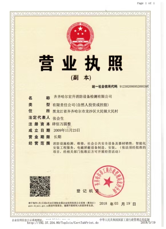 齐齐哈尔宏升消防设备检测有限公司是经齐齐哈尔市工商行政管理局批准注册的专业消防检测与消防设备维修保养服务机构。